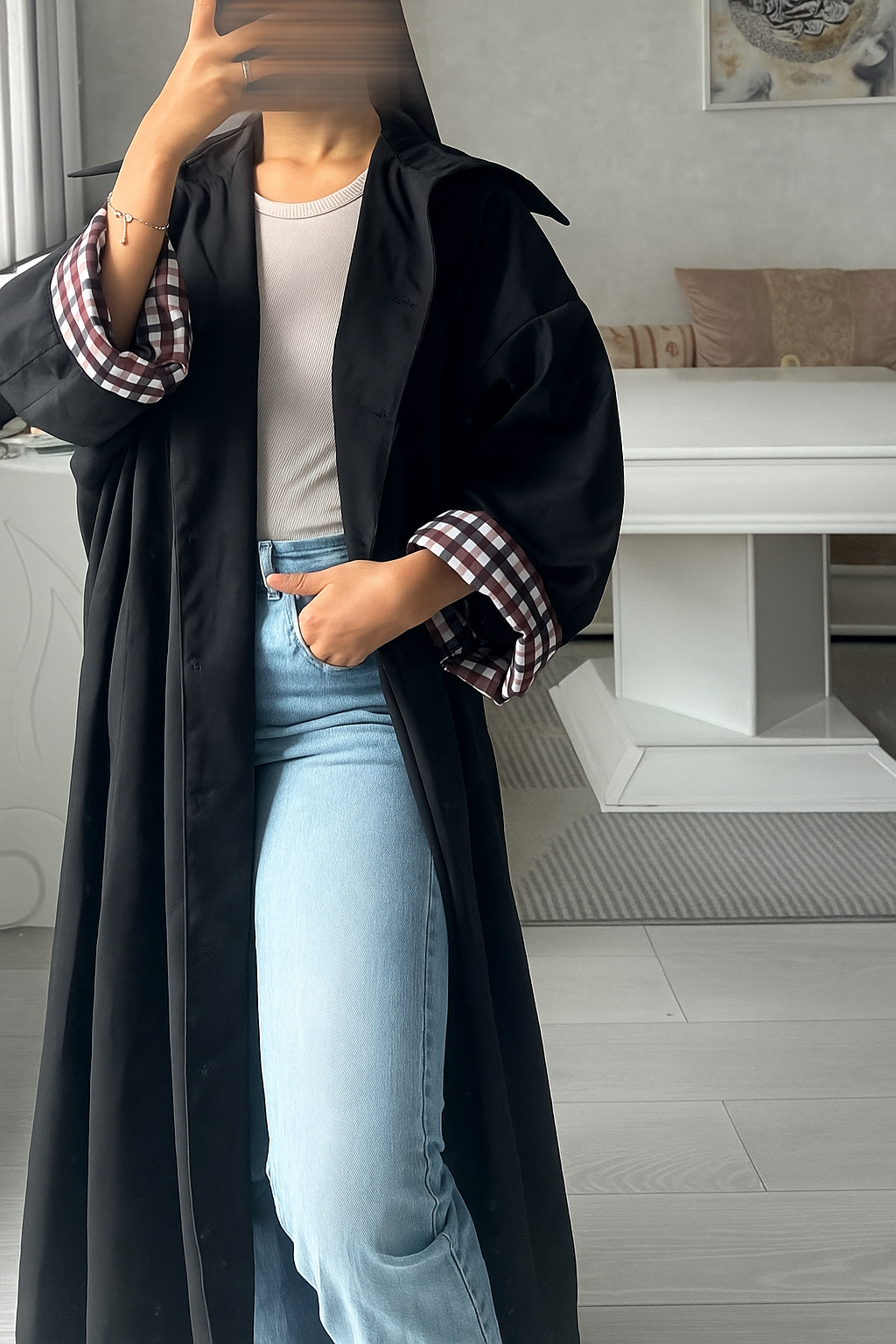 Trench long manches à carreaux